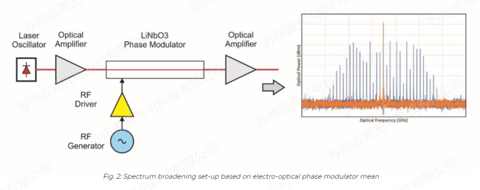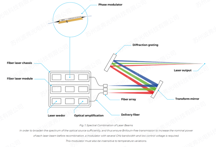 这些激光器中的每一路都通过电光相位调制器进行频率调制,后者对于抑制光纤中的非线性布里渊效应(也称为受激布里渊散射SBS)是尤为必要的。事实上,在光纤中传输的过大功率会在玻璃结构中引发声格振动。这种振动会导致布拉格光栅效应限制光的传输:相当一部分光被反射,可能会损坏种子光源及其增益介质。抑制布里渊效应的一个行之有效的方法是展宽激光器的线宽(频率调制)。通过链路中加入电光相位调制器,使这项技术成为可能。因此,在光谱合成系统中,每个通道的窄线宽激光器后面都配备有一个或者多个相位调制器。