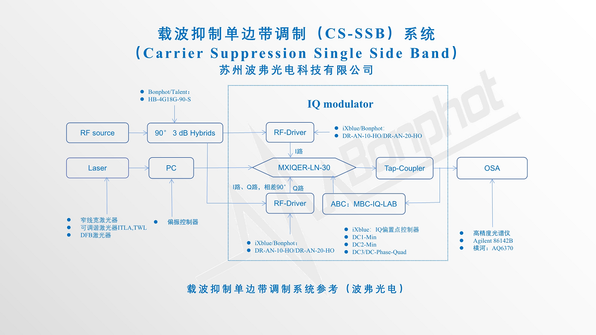 目前苏州太阳成集团tyc539官网科技有限公司提供的基于法国iXblue公司的高消光比IQ调制器(MXIQER)、配合我们提供的驱动(DR-AN-10-HO/DR-AN-20-HO)以及偏置控制器(MBC-IQ-LAB-A1),可以实现>30dB(1000:1)载波抑制比,具有无可比拟的性能及优势。
