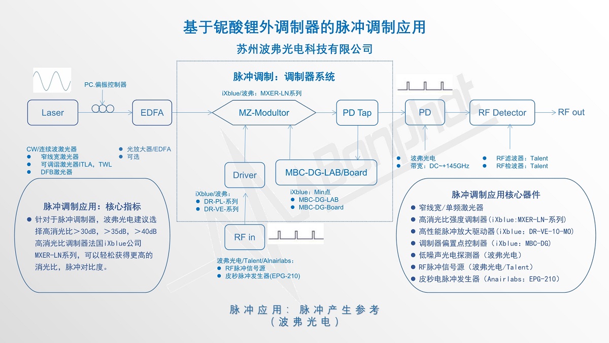苏州太阳成集团tyc539官网科技有限公司提供基于法国iXblue公司铌酸锂马赫增德尔高消光比强度调制器的脉冲调制元件的脉冲调制方案,这些方案包括常用的脉冲产生(脉冲调制)、脉冲整形、脉冲拾取等。基于法国iXblue高消光比强度调制器MXER-LN系列,可以轻松获得足够的消光比和脉冲对比度。更多详细情况请联系苏州太阳成集团tyc539官网科技有限公司相关销售人员获取。